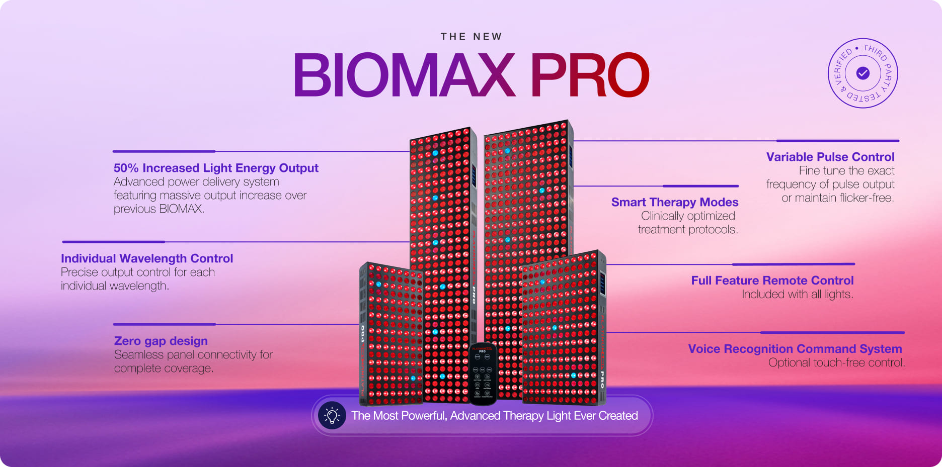 The BIOMAX PRO has five main upgrades: 50% more light energy emitted (shorter treatment times/higher power), "zero-gap" construction which eliminates the gap between multiple panels, individual wavelength control, adjustable pulse output control and the addition of Intelligent Smart Mode pre-sets. Same industry leading, medical-grade quality, just massively more powerful and precise. The BIOMAX PRO Is the most powerful and advanced human therapy light ever created with unique, revolutionary design.